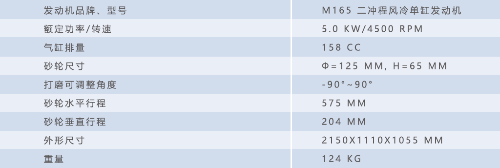 本机器由汽油发动机提供动力,适应野外操作使用,配有两套轮系统,适应钢轨波纹区域应用场合操作简单,便于操作者观察打磨角度和位置。