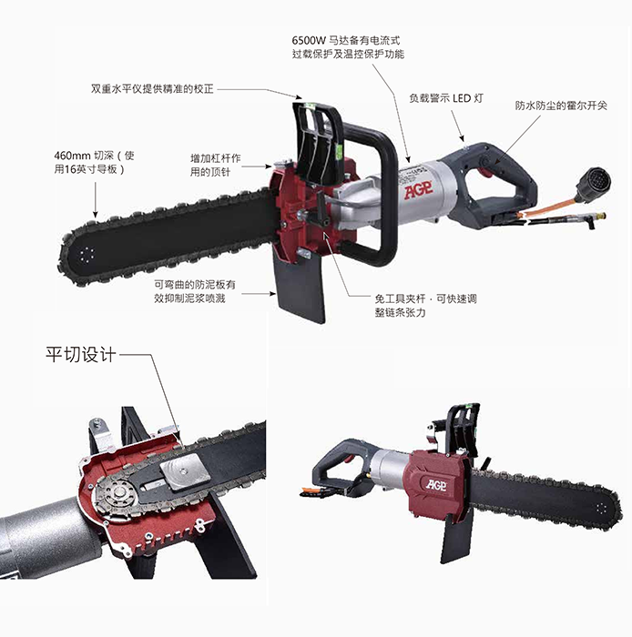 配备了6500W高频永磁同步马达的水泥链锯,非常适用于大深度切削和无过度切削的精确